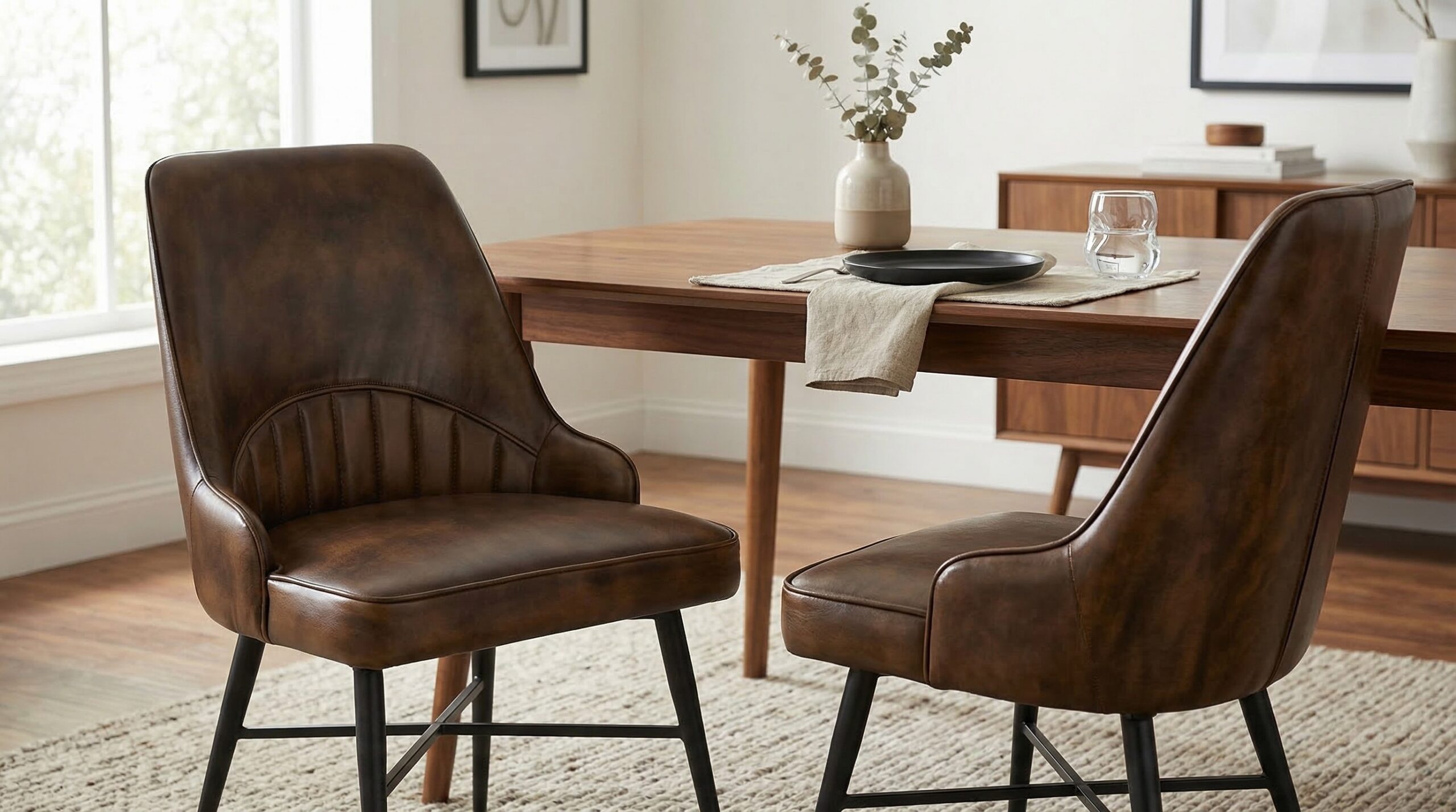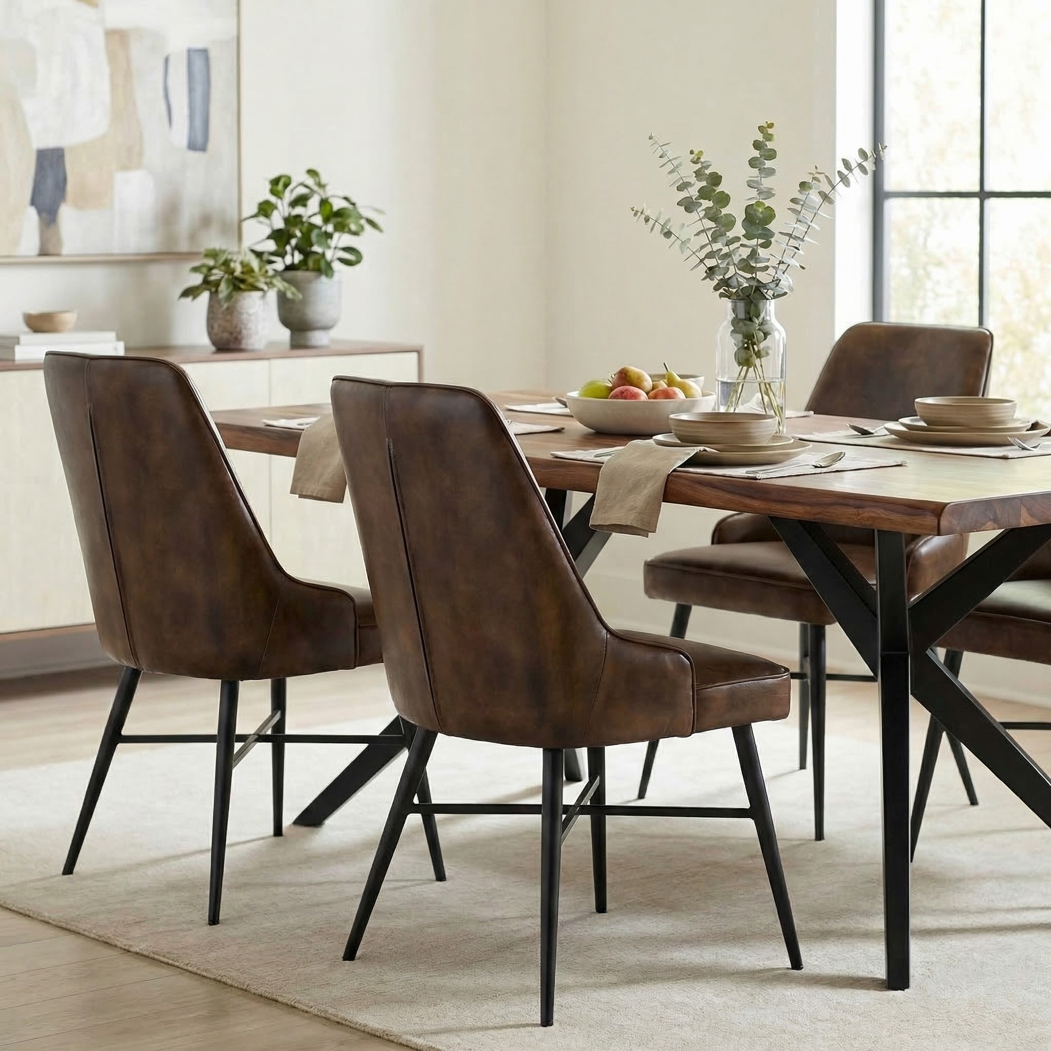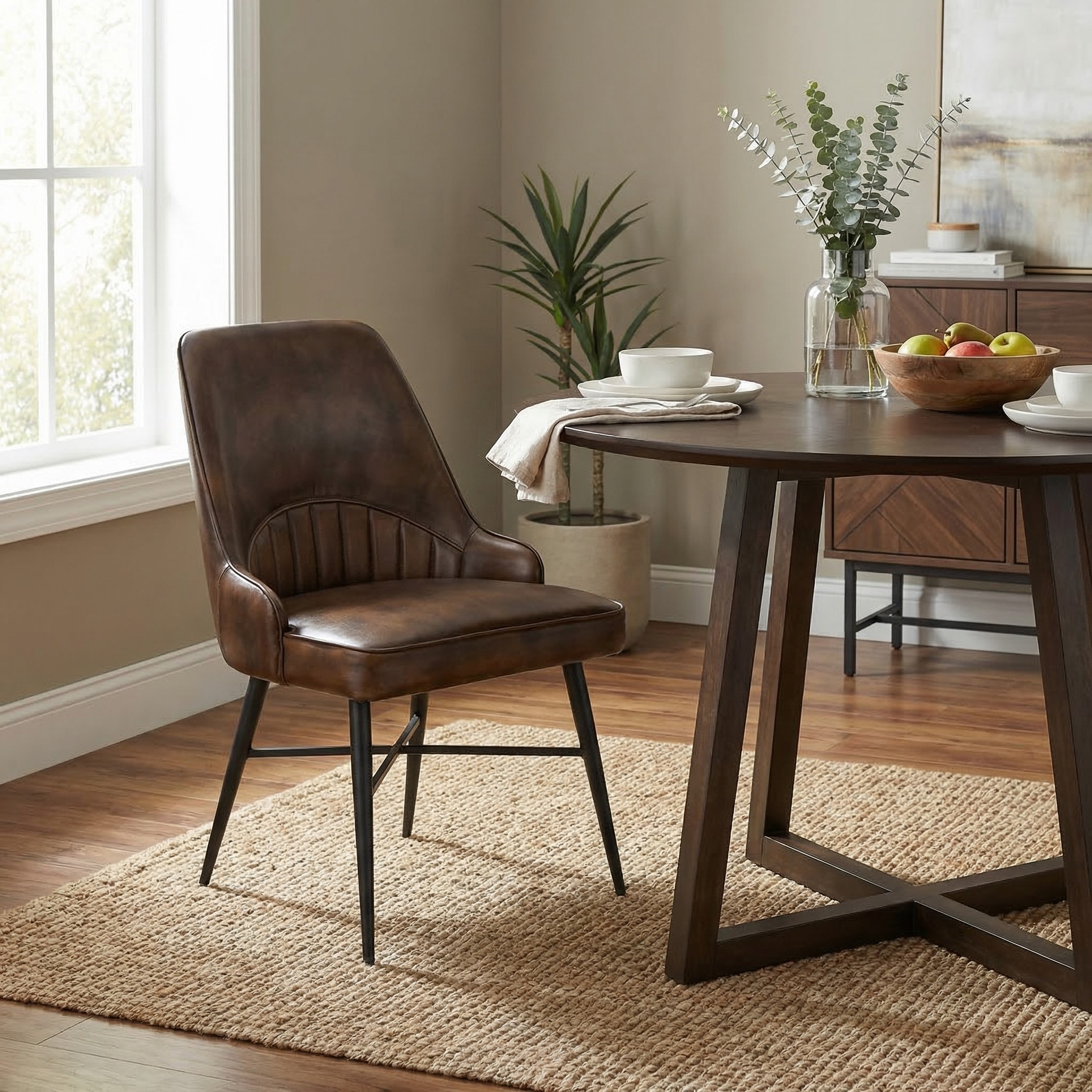 The Leeds Dining Chair features antique whiskey top grain leather with a soft burnished finish that highlights its natural character. A sculpted, channel-detailed back and padded seat provide lasting comfort, while tapered black metal legs add a modern industrial edge. Ideal for dining rooms, kitchens, or hospitality settings.